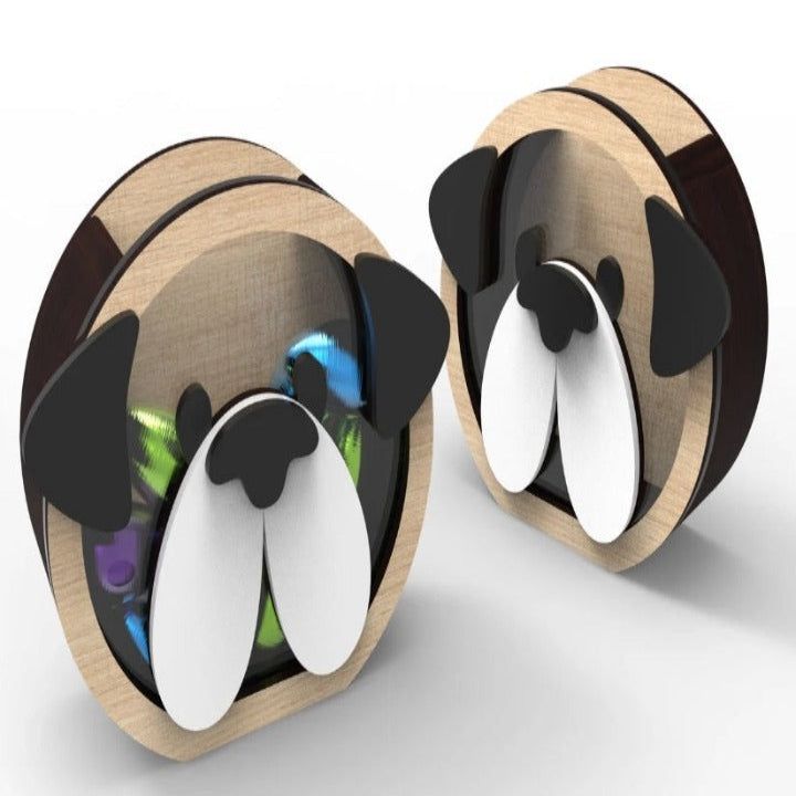 This unique Easter treat box in the shape of a dog can be used as a money box when all the chocolate eggs have been eaten. It is made from layers of mdf, ply and acrylic.