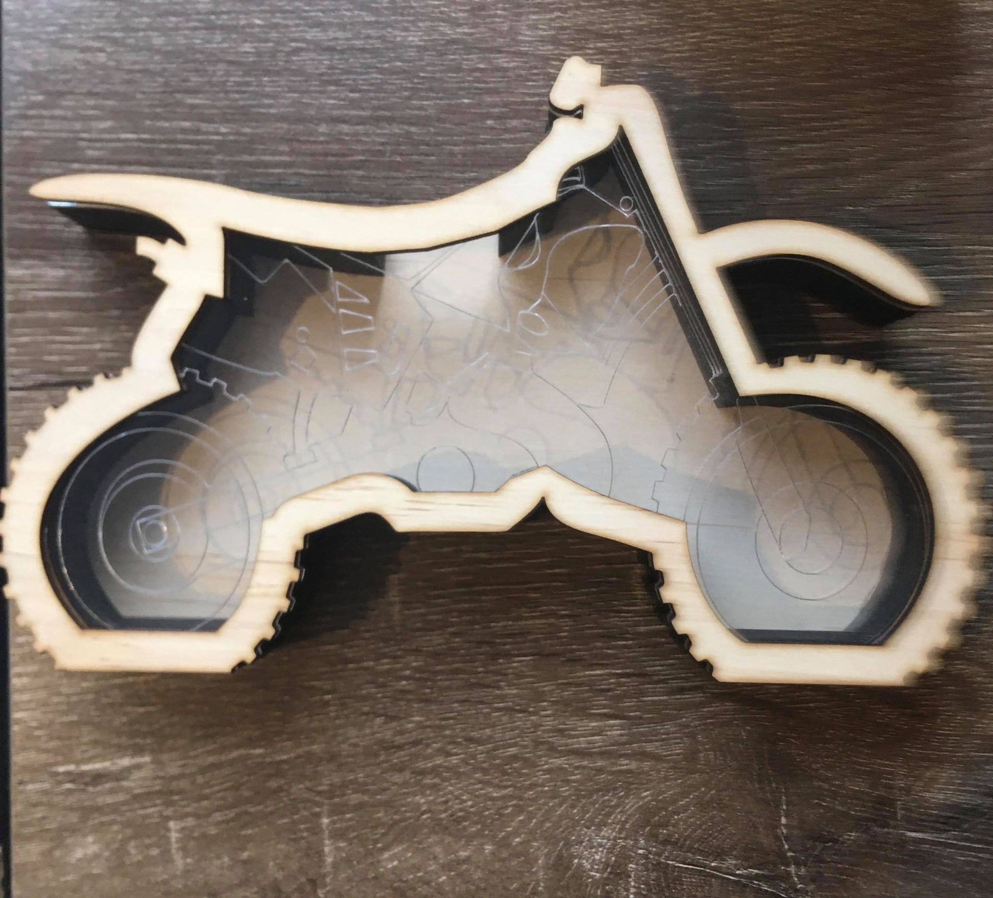 Vroom Vroom, this motorbike money box is made from layers of mdf, ply and acrylic.